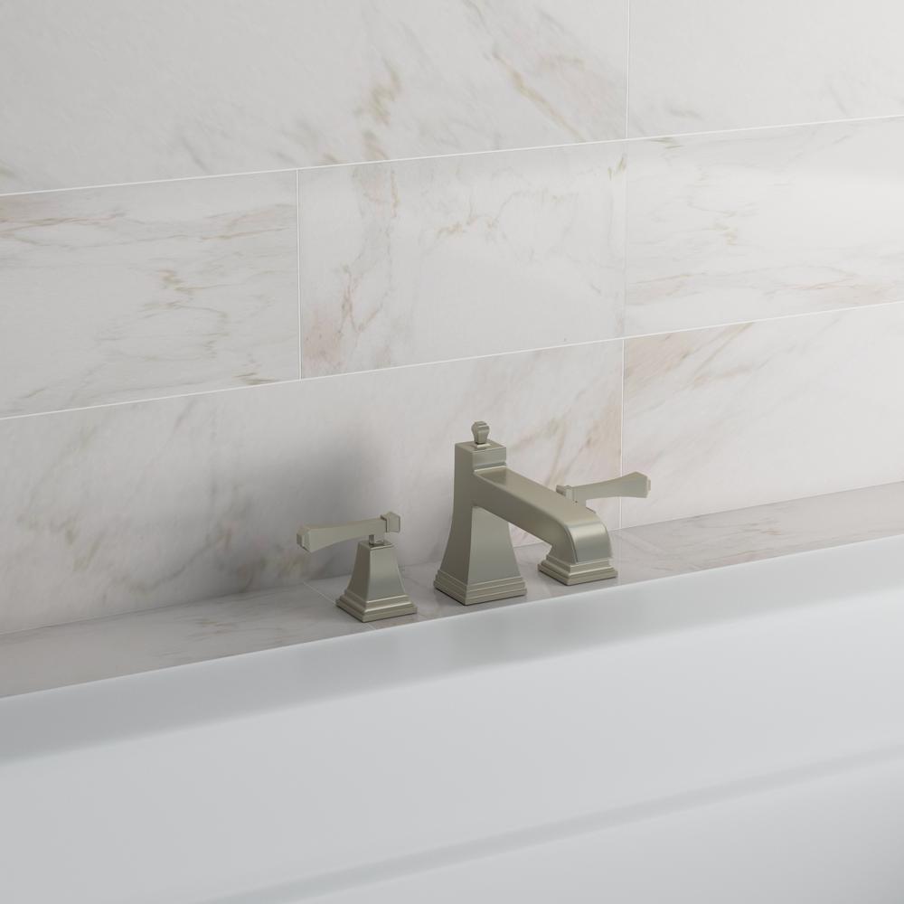 Exhibit's crisp lines and soft curves of this roman tub set echoes an